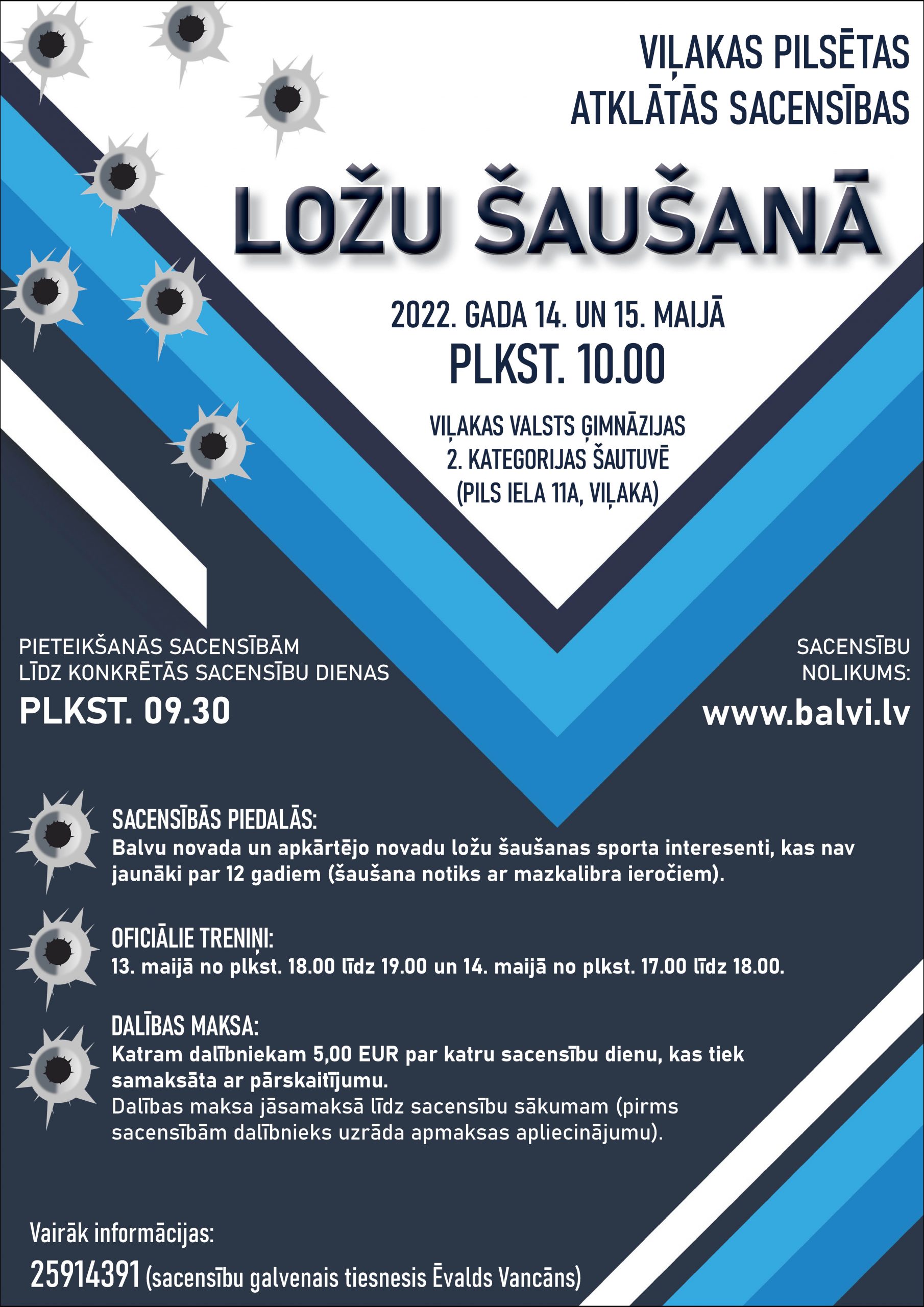 2022.gada 14. un 15. maijā plkst.10.00 Viļakas Valsts ģimnāzijas 2. kategorijas šautuvē (Pils iela 11a, Viļaka) notiks Viļakas pilsētas atklātās sacensības ložu šaušanā.