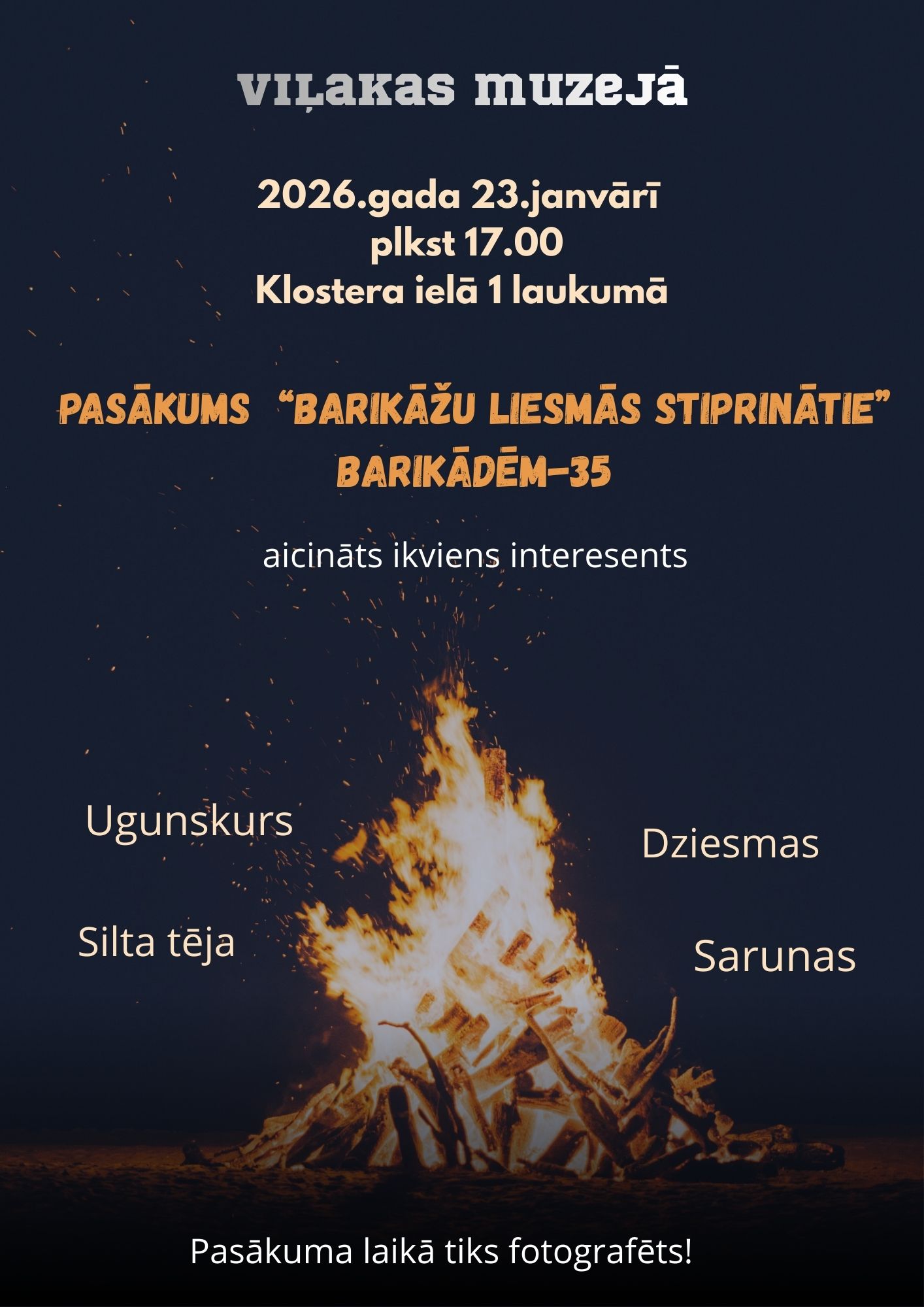 23.janvārī plkst.17.00 Viļakas muzeja Klostera ielā 1 laukumā pasākums “Barikāžu liesmās stiprinātie”. Barikādēm-35. Ugunskurs, silta tēja, dziesmas un sarunas.