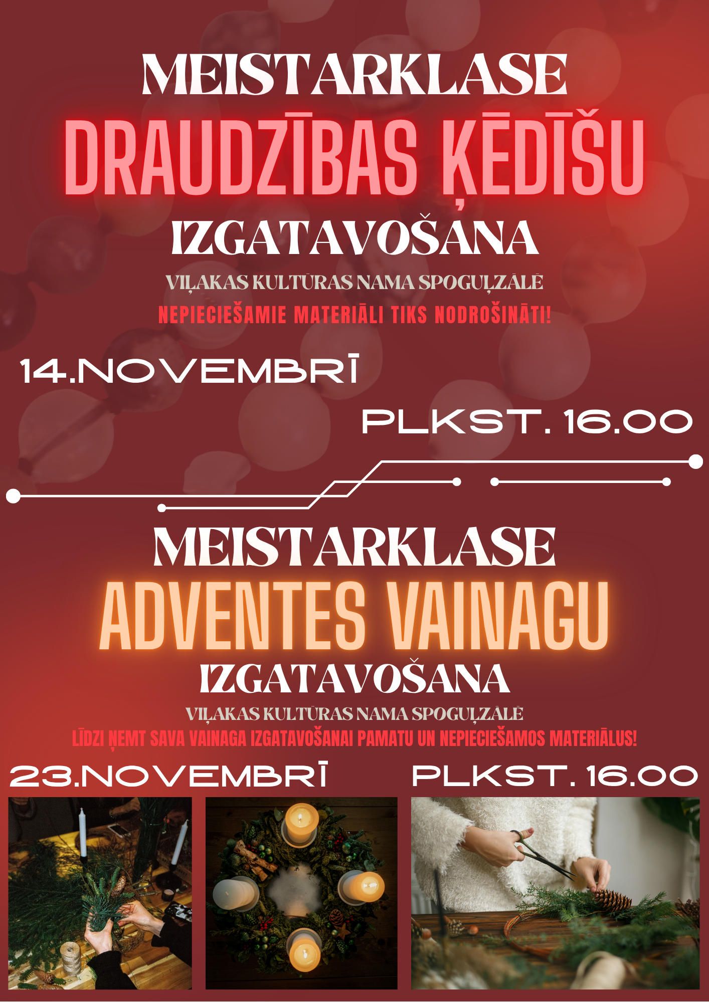 Aicinām piedalīties divās sirsnīgās un iedvesmojošās meistarklasēs Viļakas kultūras namā! 14. novembrī plkst. 16.00 DRAUDZĪBAS ĶĒDĪŠU IZGATAVOŠANA (materiāli tiks nodrošināti); 23. novembrī plkst. 16.00 ADVENTES VAINAGU IZGATAVOŠANA (materiāli jāņem līdzi savi). Nāc kopā ar draugiem, ģimeni vai kolēģiem un pavadīsim radošus vakarus gatavojoties svētkiem!