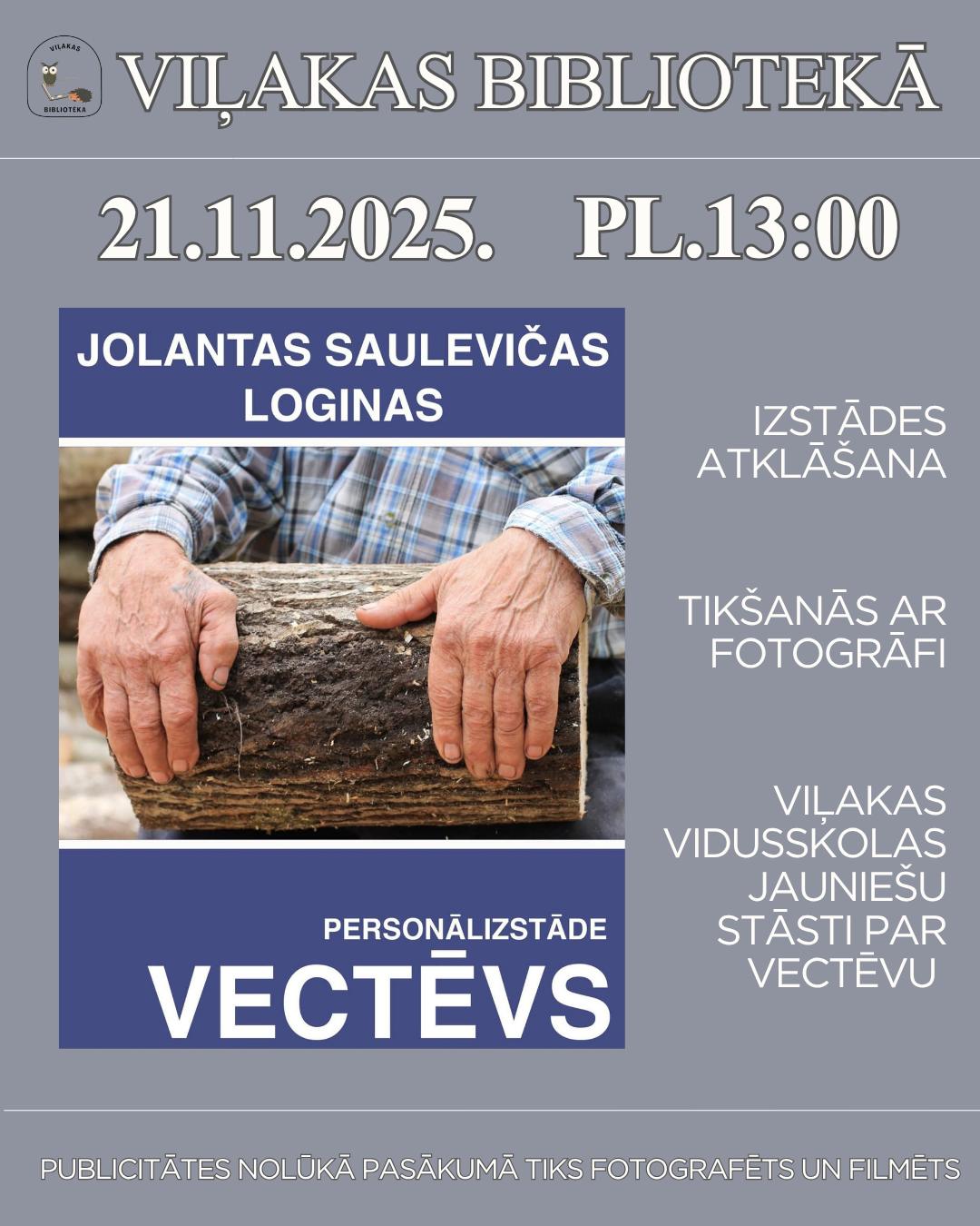 21. novembrī plkst. 13.00 Viļakas bibliotēkā – Jolantas Saulevičas Loginas personālizstādes “Vectēvs” atklāšana.