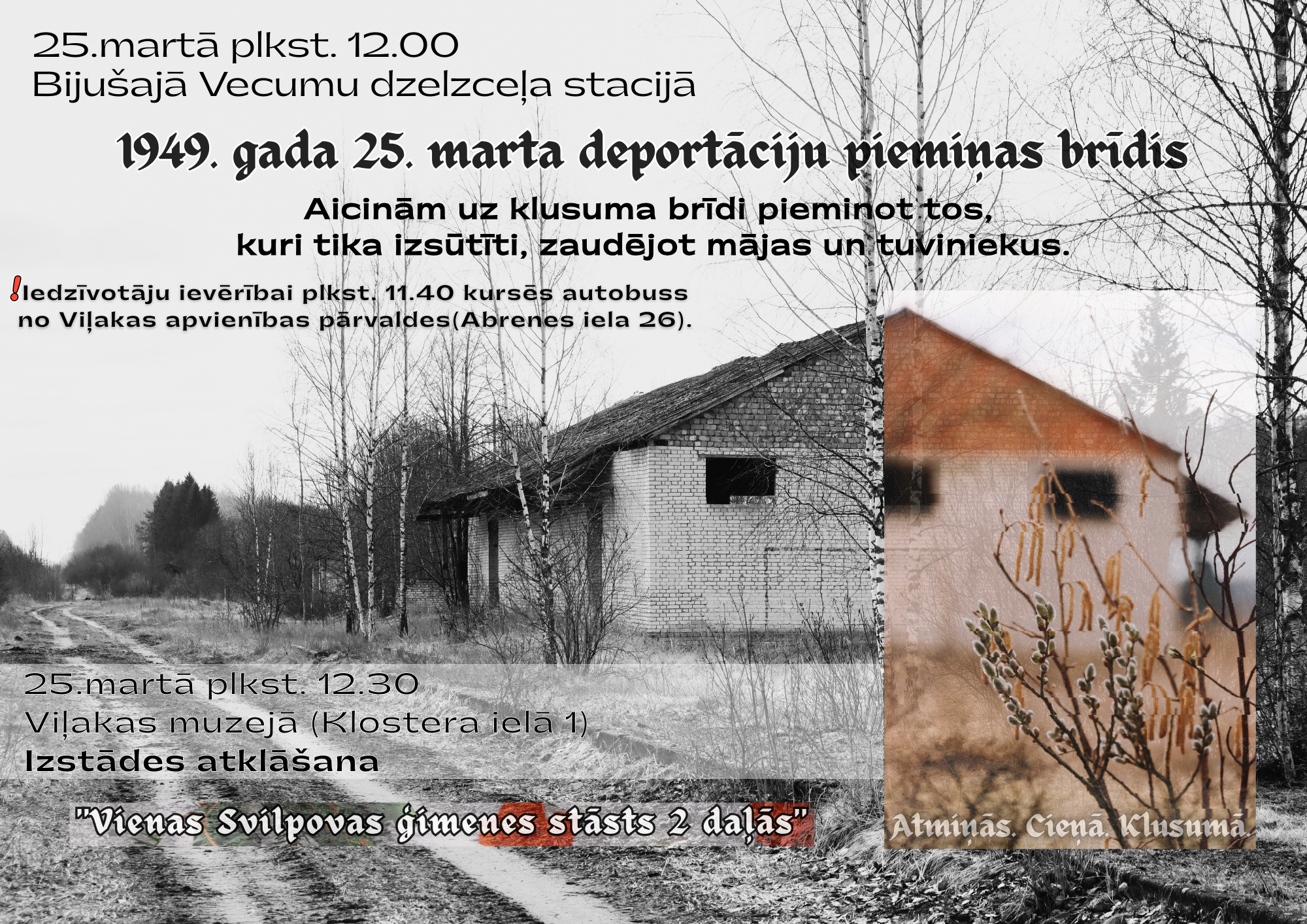 25.martā plkst. 12.00 bijušajā Vecumu dzelzceļa stacijā 1949.gada 25. marta deportāciju piemiņas brīdis.